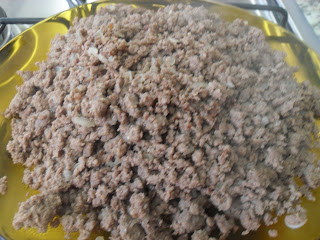 Aqueça metade da quantidade de azeite numa panela e doure meia cebola picada. Acrescente a carne moída e deixe refogar até que tenha secado toda a água e tenha fritado levemente. Retire da panela e reserve.